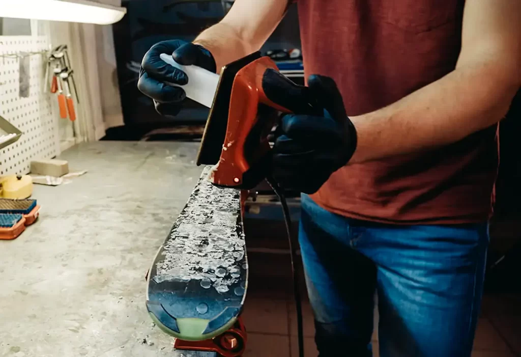 - Encerado en caliente: utiliza ceras sólidas en bloques o en polvo y para aplicarlas hace falta una plancha que funde la cera con calor, como vemos en las tiendas de alquiler en la estación. Es un encerado que dura mucho más porque la suela la absorbe con facilidad.