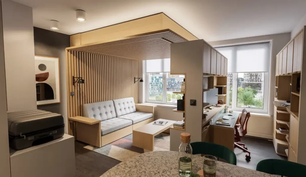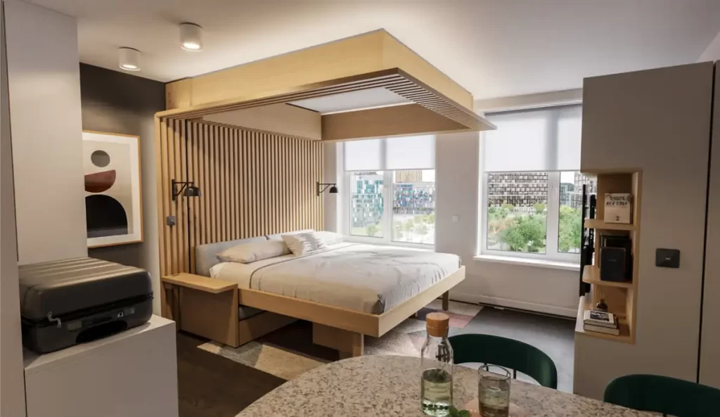 Imagínate una habitación de hotel en la que la cama se sube a un hueco en el techo para dejar espacio para otras cosas, y con sólo apretar un botón, tu voz o tu móvil.